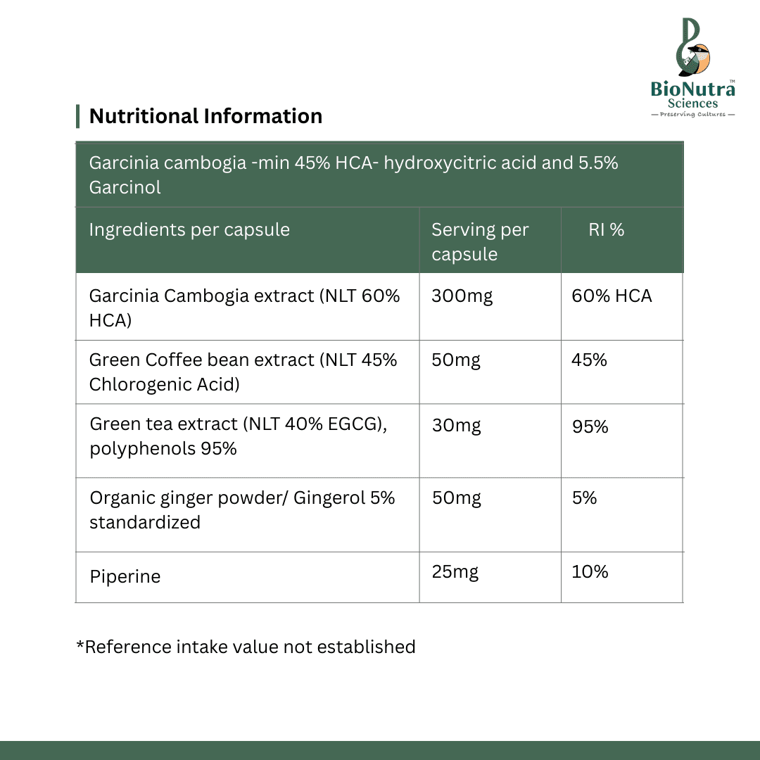BioNutra Sciences advanced Garcinia Cambogia contains 3 major ingredients, Garcinia Cambogia fruit extracts contains 60% HCA, green coffee bean contains NLT 45% Chlorogenic Acid and Green tea extracts contains NLT 60% EGCG), polyphenols 95%. Additional sub ingredients, such as Organic ginger powder, standardized 5% Gingerol for the ease of stomach acidity and piperine for best absorption.