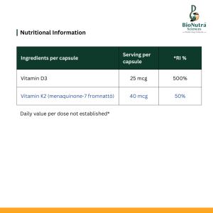 At BioNutra Sciences we have you covered with high quality Vitamin D3, Vitamin K2. This is a great combination, and they complement each other for better and finer quality bone and cardiovascular health.